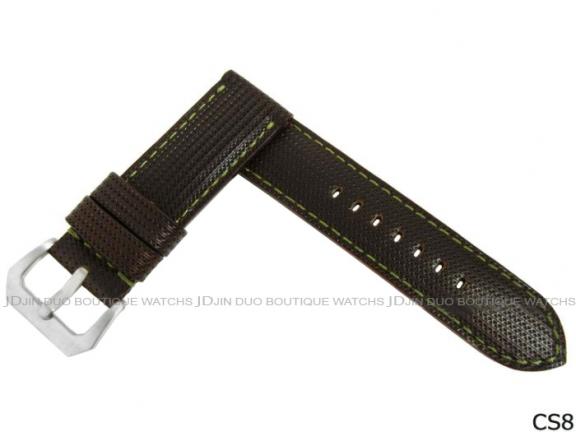 【品名】 | Ted Su 沛納海PANERAI深咖啡色牛皮手工皮錶帶 | 【材質】 | 深咖啡色對角線飾面防水帆布&黃綠色牛皮襯裡&拉絲飾面金屬錶扣&綠色車縫線 | 【特價】 | 6500元