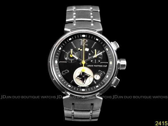 時針.分針二針時刻顯示/按壓式錶冠飾有品牌LV立體字紋/錶背鑴刻經典Monogram圓花圖騰/2點鐘位置1/10秒計時顯示/4~5點鐘位置圓型放大鏡日期窗顯示/6點鐘位置Monogram造型小秒圈/10點鐘位置30分計時顯示/日常生活防水100米/錶徑:34.15mm(不含錶冠寬)*11mm(厚) |