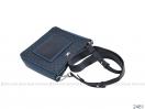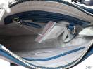 藍黑色PVC防水帆布袋身/藍色皮革紋包邊與肩背帶/卡其色布質材質襯裡/拋光銀色金屬配飾